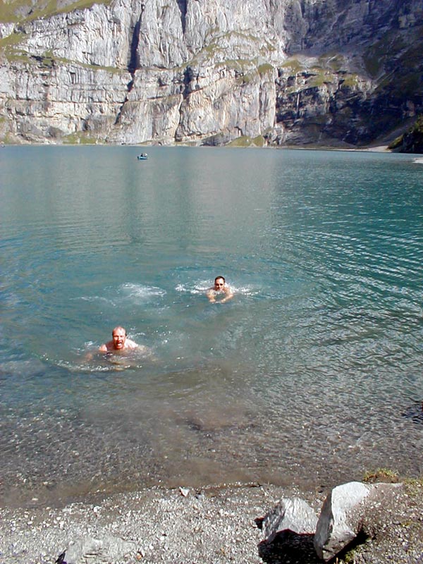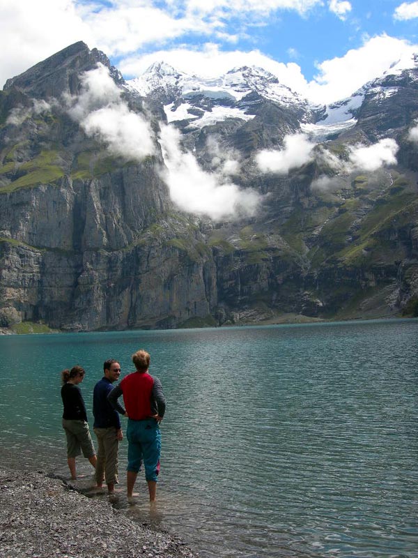 Scintilla, Ivo and Andrew test out the waters at Oeschinensee. |
