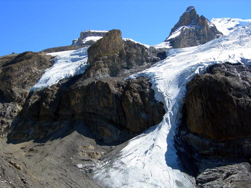The Blümlisalphütte belittled by immense glacier falls. |