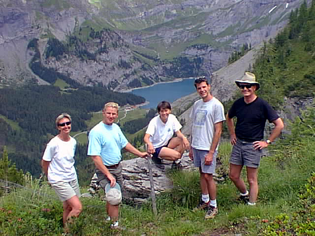 View from the Doldenhorn hut toward Oeschinensee. Mary Ann, Phil, Miya, Mark, and Chris. |
