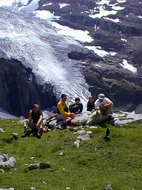 The group having lunch by a glacier fall on the way to the Blumlisalp hut. |