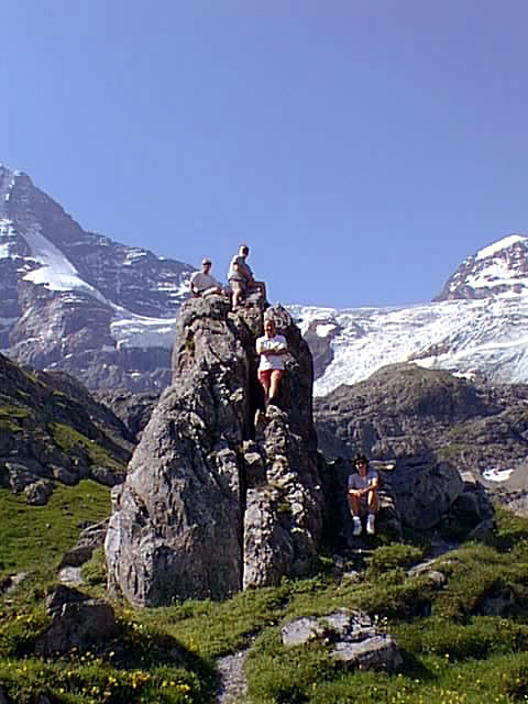 The group (Doug, Bill, Andrew, and Janice) rock climbing near Oberhornsee Lake. The Breithorn and Tschingelhorn mountains behind. |