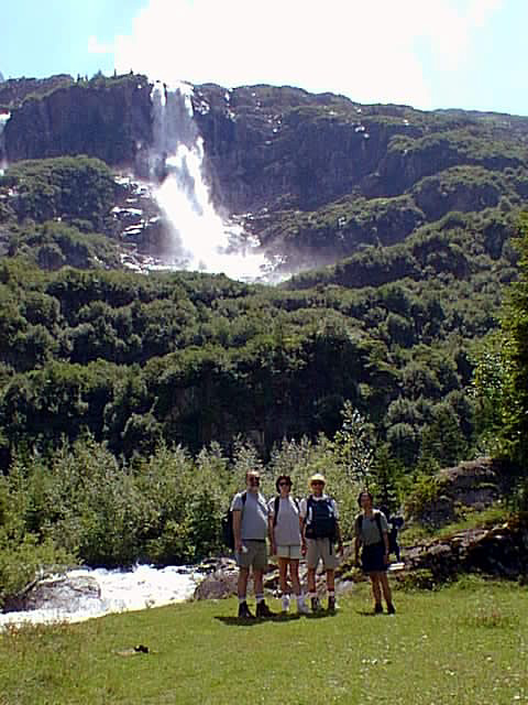 The group (Bill, Janice, Doug, and Miya) in front of the Schmadribach Falls between Oberhornsee and Trachsellauenen. Magnificent! |