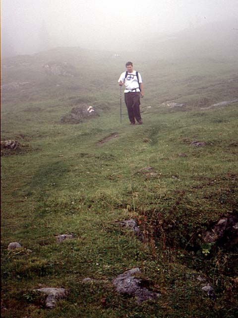 Rob on an alpine meadow in the low cloud. |