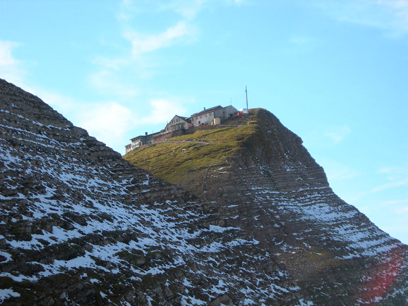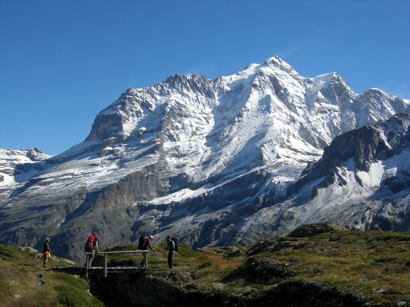 Grindelwald to the FaulhornGrindelwald 1616 m. to Hotel Faulhorn at 2680 m. Descending through trees to Grund, our low point of the day, we start our climb to Grindelwald and continue through a pine forest to alpine meadows with fantastic views. Continuing to Bachsee Lake, we follow an old donkey path that leads to steeper and more barren terrain. A short, steep incline finally brings us to the Faulhorn Hotel. Very famous sunrise and sunset view point! |