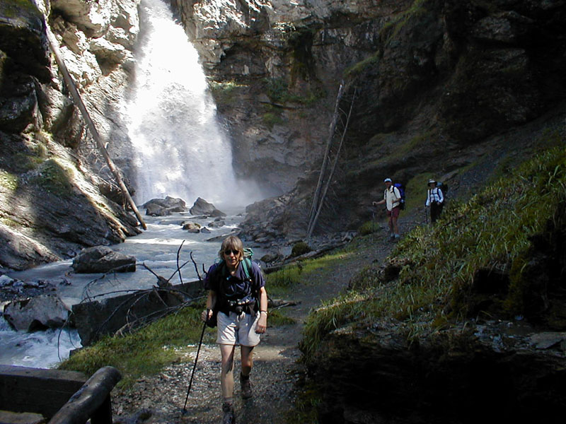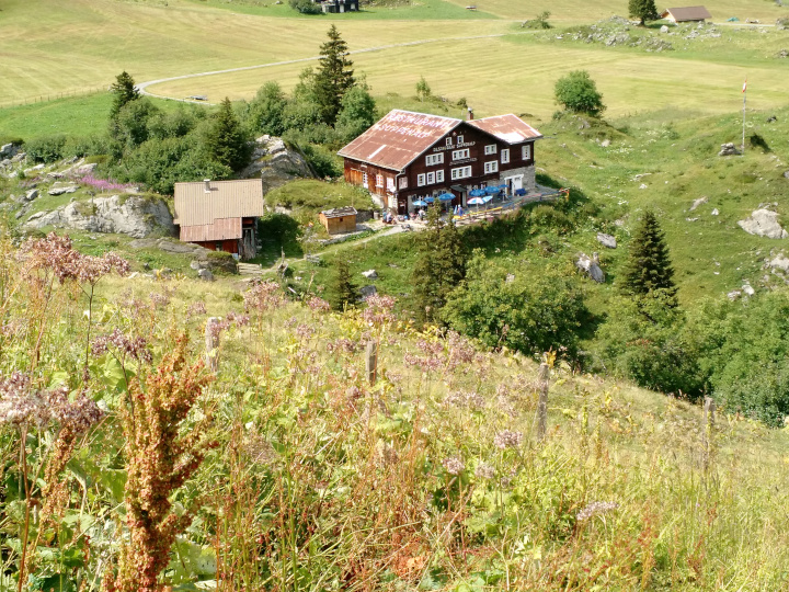 Suppenalp to ObersteinbergSuppenalp 2039 m. to Obersteinberg 1774 m. Steep descent through pastures and trees to a V-shape valley where we wander down to 1253m. After a gradual ascent through pine woods we shirt around a valley corner and head up the valley to high meadows, where we finally see our hotel! |