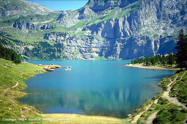 Kandersteg to OeschinenseeKandersteg 1176 m. to Oeschinensee, 1593 m. A gentle incline leads to pine woods and a steeper ascent. Alpine meadows and flatter terrain lead us on a gradual descent to the Oeschinensee lake and hotel. |