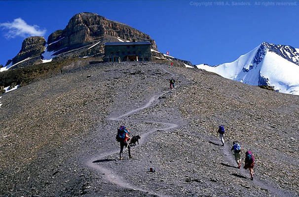 Oeschinensee to BlümlisalpOeschinensee 1593 m. to Blümlisalphütte (mountain hut) 2837 m. Skirting the lake we ascend to meadows and alpine farm buildings. We reach the first tier in four in our climb to the Hohtürli pass and hut. Passing more small cheese farms we leave the tree line and continue to more barren terrain in full view of the Blümlisalp glacier fall. A welcomed traverse at 2408 m. leads us to the final steep ascent to the hut. From the hut the views are magnificent. Sunsets! |