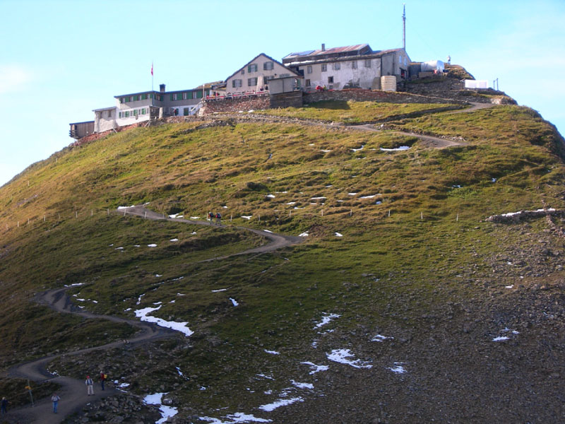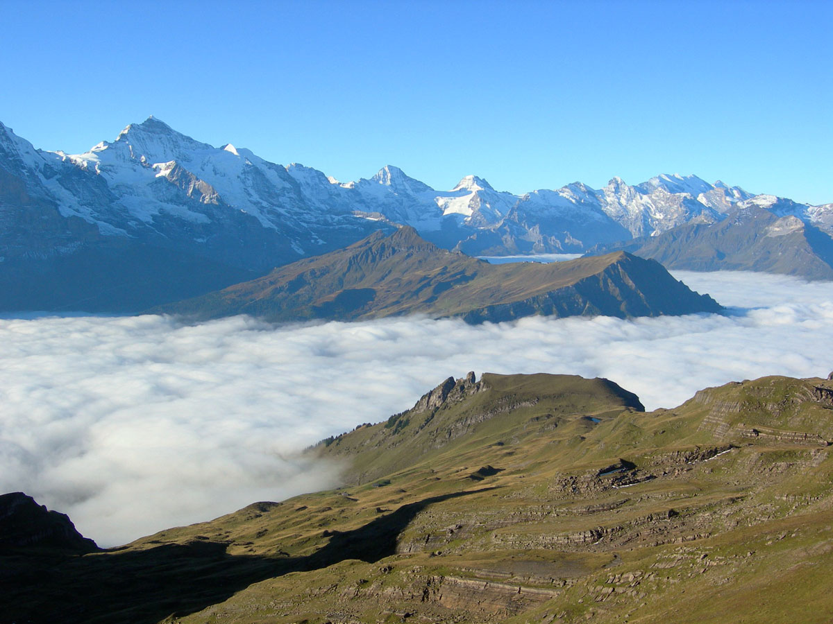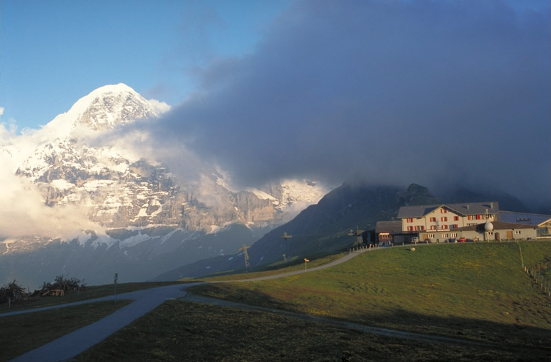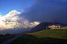 Grindelwald to FaulhornGrindelwald 1166 m. to Faulhorn 2680 m. Leaving the village on a gentle incline through meadows, we pick up an ibex route away from the usual paths, and follow it along the valley floor to the Bachsee (lake) 2265 m. An old donkey path leads to steeper and more barren terrain. A short steep incline brings us to the Faulhorn. Very famous sunrise and sunset view point. |
